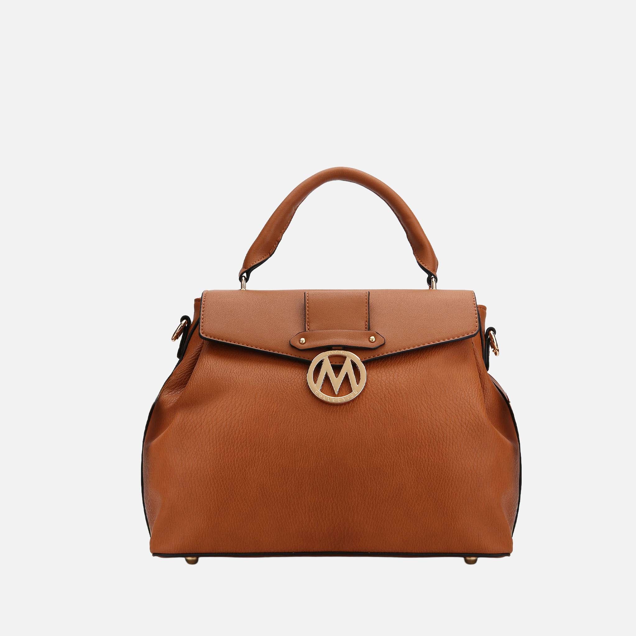 FEATURE: Â Design with Luxurious gold tone embellishments. The Aurora Satchel is a perfect size for all occasion, smooth top handles and datable strap for shoulder or Satchel wear, Flap with a magnet snap for closure, exterior back zipper pocket. The Aurora Satchel comes with a matching wallet.