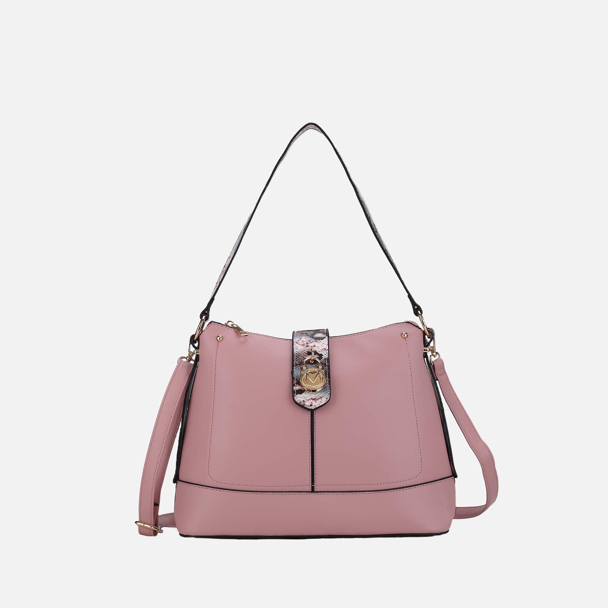 Our Ezra Shoulder bag will top off any look with polished charm. Crafted from smooth high-quality vegan leather and matching faux-snake embossed trims, our Ezra Shoulder Bag is a modern take on the wardrobe icon. Your belongings will be safe with a magnetic snap fastening and a top zipper closure. Unzips it to reveal a fully lined interior with a wall-zippered pocket and two slip pockets. The exterior features a convenient back zippered pocket. Designed in a structured silhouette, and gold-tone embellishments and has a front lock for decorative purposes. Wear this style on your shoulder by the top handle or attach the shoulder strap and carry it crossbody for hands-free ease. This style has a flat base and feet for stability.