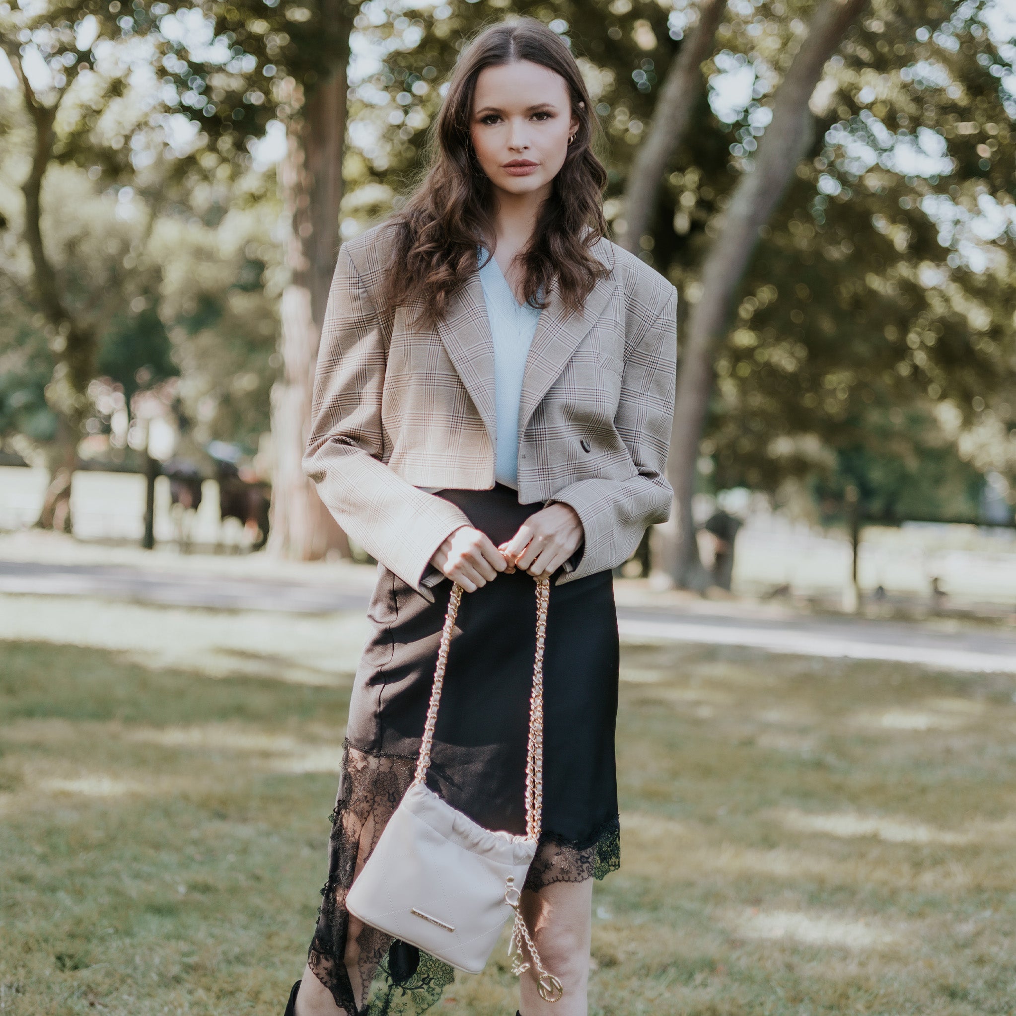 The detachable crossbody chain strap measures 25in