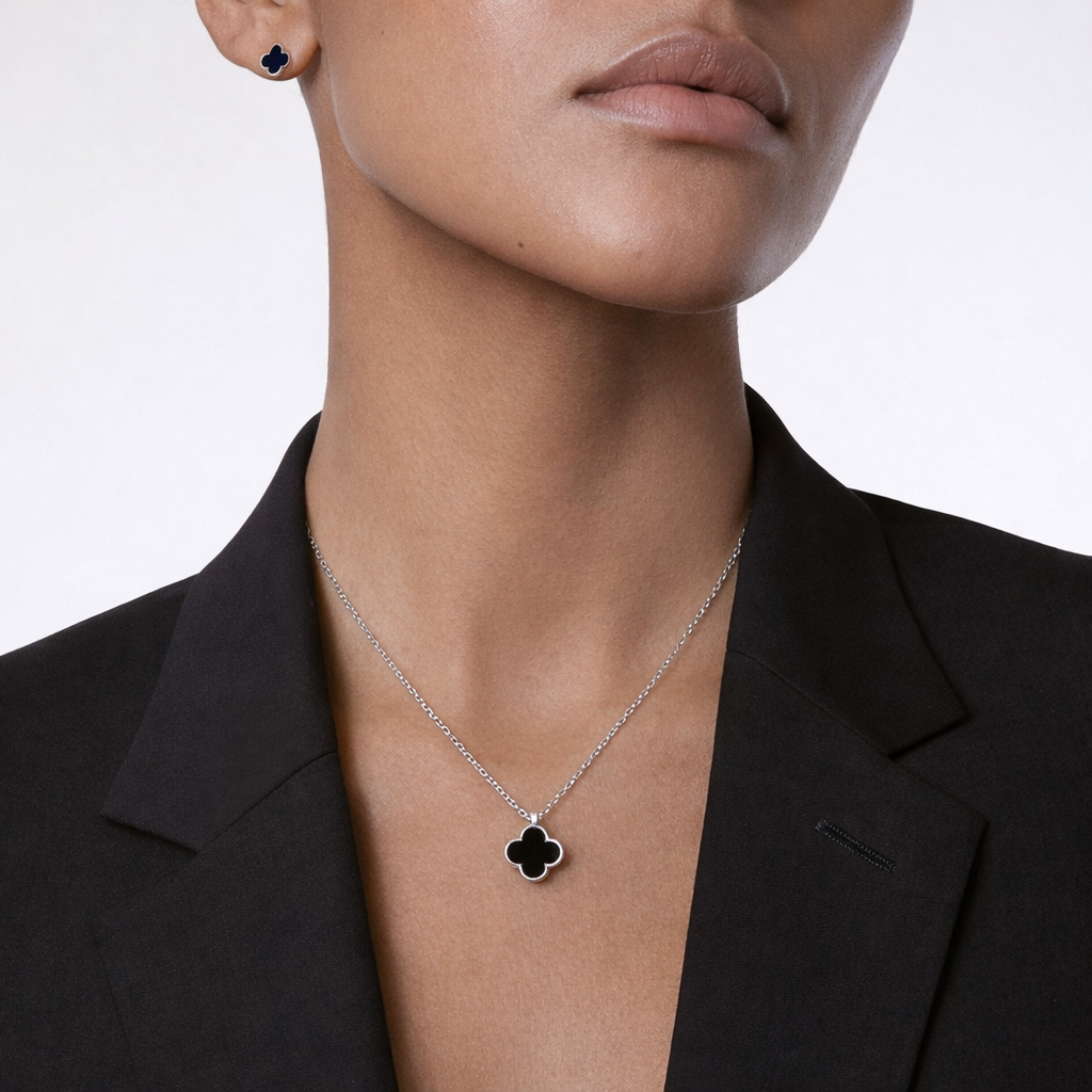 The Noir Set is defined by clean lines, bold contrast, and modern simplicity. Featuring a sleek clover motif accented with deep black enamel, this matching necklace and stud earring set delivers a refined, minimalist look that feels intentional and effortlessly stylish. Designed to elevate everyday outfits, it offers subtle edge while remaining timeless and wearable.
